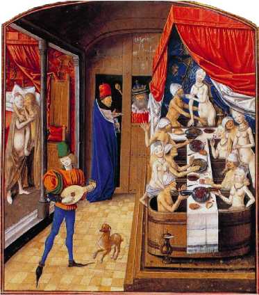 Валерий показывает императору Тиберию распущенность нравов в борделе при банеМастер Антуана Бургундского, ок. 1470.