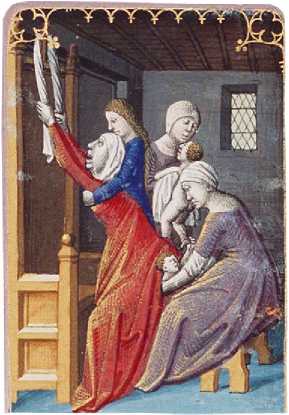 Повитуха принимает роды (рождение Исава и Иакова) Миниатюра Мастера Франсуа. До 1480 г.