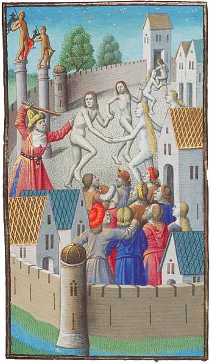 Платон изгоняет танцующих мужчин и женщин Миниатюра Мастера Франсуа из книги «О граде Божьем». Между 1475 и 1480 гг.