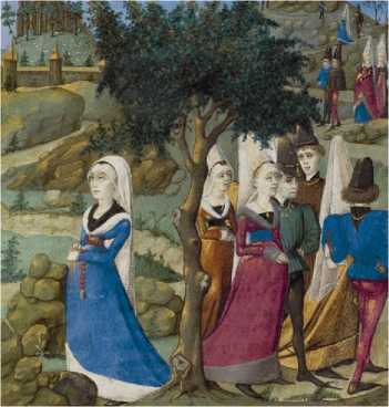 Придворные на прогулкеМиниатюра из манускрипта «История о двух возлюбленных». Ок. 1460–1470 г.