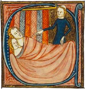 Священнослужитель наблюдает за супружеским половым актом Миниатюра из манускрипта Джеймса ле Палмера «Всякое благо». До 1375 г.