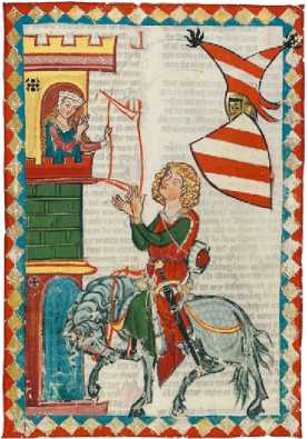 Трубадур под окном дамыМиниатюра из «Манесского кодекса». Между 1305 и 1315 гг.
