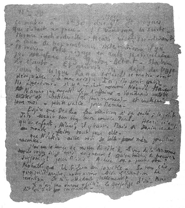 Надеюсь, Денден [Дениза] будет беречь себя; малышу Жито [Житомиру – так Дениза Берр в шутку называла своего еще не родившегося ребенка, возможно, в честь наступления советских войск под Житомиром] будет хорошо у кузена Поля [у акушерки в Аржевиле]. У Анри [Реймона Берра] с собой только одна дочь Элен, она ему дорога. Но если появится на свет [родит] Дениза, сделайте все для нее.