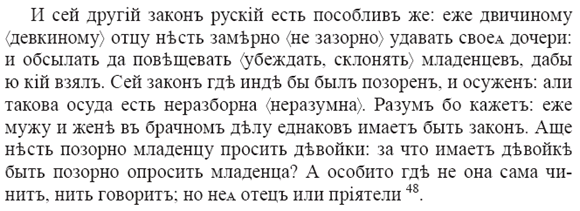 Обычай навязывать невесту зафиксирован уже в 1663 г. в «Русском законе» автора «Записки Юрия Крижанича о миссии в Москву 1641 г.», который два раза был в России и провел около 15 лет в качестве ссыльного в Тобольске: [79]