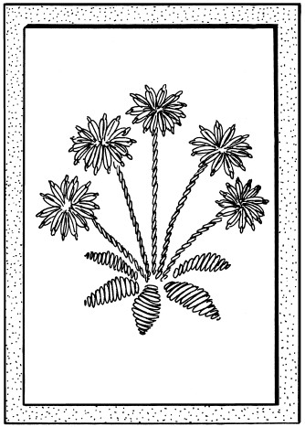Из плотного картона вырезать прямоугольник размерами 12 X 16 см. Простым карандашом нарисовать в центре прямоугольника ландыши. Положить заготовку на подложку и по контурам рисунка сделать шилом дырочки. На стебельках размещать отверстия через каждые 0,5 см. Отдельно выполнить дырочки для цветов (для каждого цветка понадобятся 2 дырочки). Для листочков отверстия надо сделать у их оснований и на концах. На цветах и чашелистиках дырочки можно выполнить только у оснований и на концах лепестков.