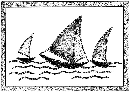После чего вышить все линии мотива стебельчатым швом нитками мулине в 2 сложения. Корпуса кораблей оформить коричневыми нитками, паруса выделить красными, голубыми и зелеными тонами. Волны выполнить голубыми нитками.