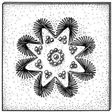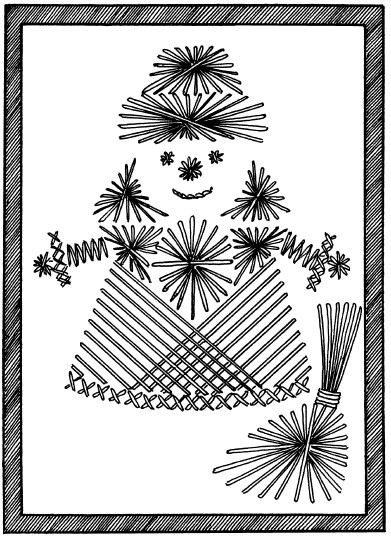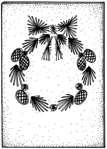 В первую очередь вышить бантик в верхней части венка желтыми нитками мулине в 2 сложения. Затем выполнить веточки зелеными нитками мулине в 2 сложения. Здесь стежки обязаны сходиться в одной точке. Каждый стежок на лицевой стороне должен начинаться из центра мотива. Ягоды оформить красными нитками в 1 сложение в технике заполнения окружности. Можно заполнить их так же, как и бантик, прямыми стежками, проходящими через окружность, затем выделить контуры ягод швом «назад иголку». Шишки следует сперва раскрасить пастелью или цветными карандашами. И только потом вышить их по контурам коричневыми нитками в 1 сложение стебельчатым швом. Из белой бумаги вырезать прямоугольник таких же размеров, что и у самой открытки, и прикрепить его к ее обратной стороне клеем ПВА (рис. 23).