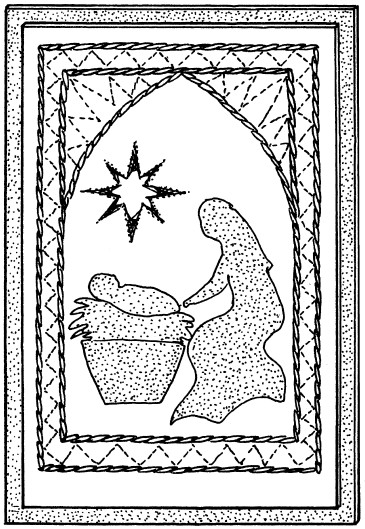 Из плотного картона вырезать прямоугольник размерами 12x18 см. Из темно-бежевой или кремовой бумаги вырезать фигурки склоненной женщины и младенца, а также ясли.