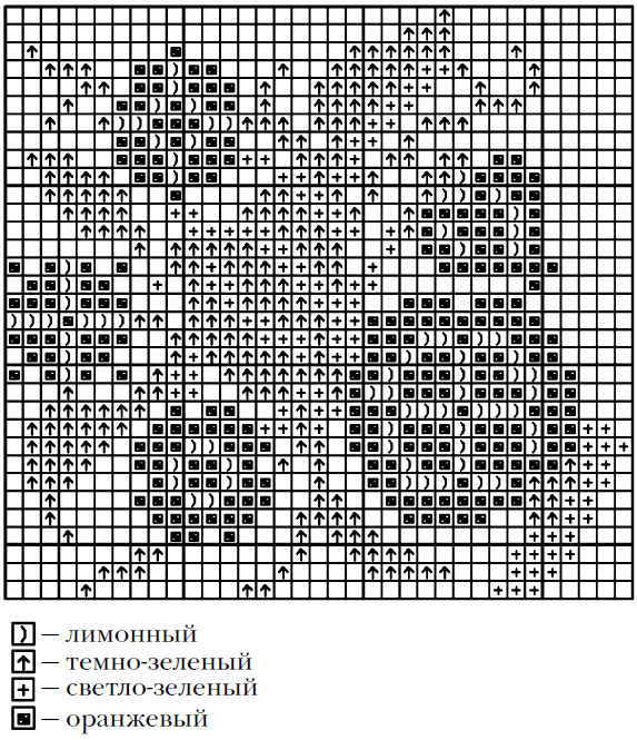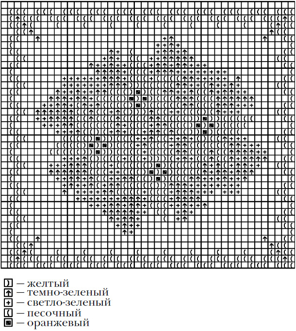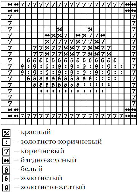 Вышивать крестиком мулине в 2 сложения на перфорированной бумаге по счетной схеме (рис. 26). Начать вышивать от середины, обозначенной на схеме стрелкой.