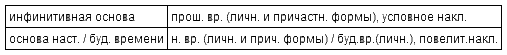 От основы инфинитива образуются, помимо неопределённой формы, личные и причастные формы прошедшего времени (если глагол не имеет иной основы прошедшего времени) и условного наклонения.