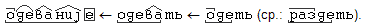 Таким образом, словоформа одевание имеет окончание -е со значением именительного или винительного падежа единственного числа, словообразующие морфемы: суффикс -ни[й’]– со значением абстрактного действия, суффикс -ва– со значением несовершенного вида, приставку о– и связанный корень -де—. Основа слова одеваний—.