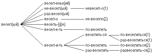 В этих словарях по алфавиту расположены непроизводные слова, к которым построены словообразовательные цепочки, учитывающие все производные этой непроизводной основы. Непроизводное слово со всеми его производными называется словообразовательным гнездом. В качестве примера приведём словообразовательное гнездо слова весёлый:
