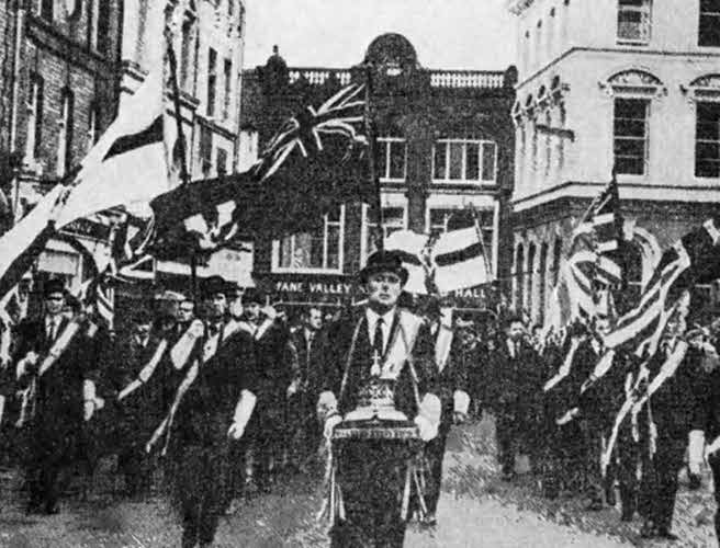 Протестантская церковь была тесно связана с юнионистской партией посредством оранжистского ордена. Эта полуполитическая, полурелигиозная организация стала опорой юнионистов в борьбе против ирландского национально-освободительного движения. Структура ордена, состоящая из разветвленной по всей стране, хорошо налаженной сети оранжистских лож, была использована организаторами юнионистской партии. Юнионистские политики становились членами оранжистских лож, а руководство последними проникало в аппарат партии. Оранжизм с его воинствующей идеологией антикатолицизма стал неотъемлемым элементом юнионизма. С момента образования партии оранжисты оказывали ей всяческую поддержку, выступая против попыток введения гомруля. Где бы ни начиналась демонстрация гомрулеров, контрдемонстрация оранжистов объявлялась в тот же день, в тот же час, в том же районе. Лишь с помощью полиции удавалось предотвратить столкновения. На первом же митинге оранжистов в защиту унии в 1886 г. присутствовало 20 тыс. человек. Был принят ряд резолюций, отвергающих ирландский парламент и призывающих в случае его введения к сопротивлению силой. Одна из резолюций предписывала оранжистам «предпринимать необходимые шаги для сохранения Унии»{76}.
