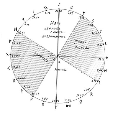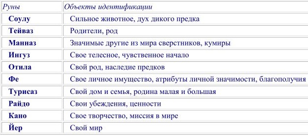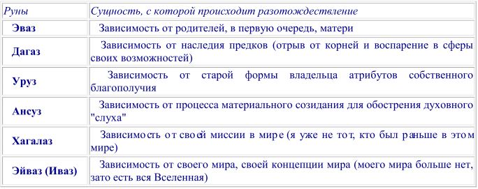 Развитие личности проходит через последовательные фазы идентификаций (отождествлений) и разотождествлений. Образцы для идентификаций берутся изнутри (заложенные в генетической памяти) и снаружи – родительские сценарии, значимые другие. Смена образцов идентификации подчиняется закону диалектики: «отрицание отрицания», по которому старое свергается новым и сильным, а то в свою очередь сменяется еще более современным и сильным. Если идентификация реализуется механизмом впитывания личностью как промокашкой неких образов, то разотождествление возможно через механизм отражения, отталкивания, рефлексии, критического отношения к себе и другим. В этой системе соблюдается еще один закон диалектики «единства и борьбы противоположностей», центробежных и центростремительных сил, впитывания и отторжения. Накопление потенциала действия (количества) между полюсами противоположностей приводит к качественным скачкам в развитии, новым во внешнем проявлении и внутреннем содержании этапам. Теперь перед нами третий закон диалектики – «перехода количественных изменений в качественные». В рунах вполне наглядно отражаются последовательные ступени, как идентификации, так и разотождествления, хотя их сопоставление остается достаточно приблизительным. На самом деле каждая руна представляет собой ступеньку, элемент целостного сюжета нашей судьбы во всей ее многоплановости, в котором заложена дихотомия отождествлений – разотождествлений. Однако некоторые руны все же являются узловыми моментами развития после периодов относительно спокойного развития событий. В следующей таблице отражена последовательность идентификаций – отождествлений в личной биографии человека, начиная от рождения.