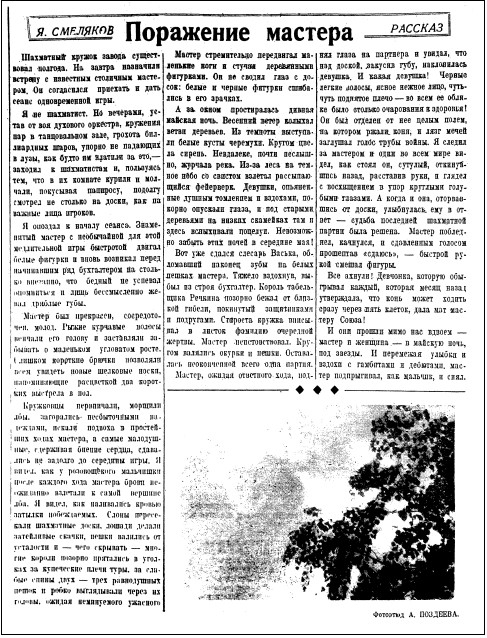 Вернувшись после сеанса в редакцию, Ярослав набросал по свежим впечатлениям короткую заметку и принялся за рассказ, чтобы разнообразить газету, сделать её интереснее для ребят. Он засиделся за полночь, но задуманное выполнил и даже сам перепечатал текст на пишущей машинке: черновик был настолько исчёркан, что так вышло быстрее, чем перебелять вручную для машинистки. Ему ведь очень хотелось поставить рассказ, названный «Поражение мастера», в текущий номер за 2 июня 1937 года. Смеляков ярко и точно передал атмосферу сеанса одновременной игры за исключением финала: у него мастер одну партию проиграл, поражённый красотой своей неопытной соперницы: «И они прошли мимо нас вдвоём – мастер и женщина – в майскую ночь, под звезды. И, перемежая улыбки и вздохи с гамбитами и дебютами, мастер подпрыгивал, как мальчик, и сиял».