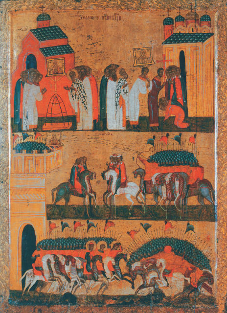 В верхнем регистре иконы святыню торжественно переносят к главному храму Новгорода – Софийскому собору. В среднем встречаются послы враждующих сторон, и тут же начинается бой – стрелы летят в защитников Новгорода, поражая и чудотворную икону на крепостной стене. «Богоматерь Знамение» «отвернулась» от суздальцев, испустила слезу, и на войско завоевателей средь бела дня напала тьма. Внизу мы видим итог чуда, явленного Небесной заступницей.