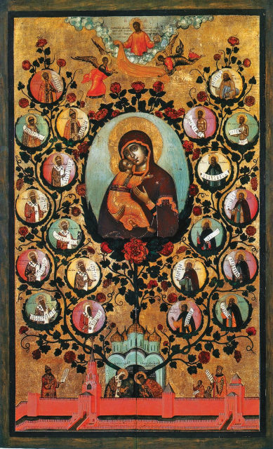 На этой иконе впервые в отечественном искусстве представлены раздумья о русской истории и о величайшей русской святыне – «Богоматери Владимирской». Древо государства Московского, ветви которого прорастают сквозь Успенский собор, сажают князь Иван Калита и первый московский митрополит Петр. Образ Владимирской Божьей Матери – главной покровительницы и заступницы Русского государства – осеняет и объединяет собой все древо. На его ветвях цветут пышные цветы, свисают виноградные грозди как напоминание о райском саде, который ожидает праведников. Среди этих «райских кущ» плоды древа государства Московского – медальоны с обликами владык духовных и светских, своими неустанными трудами и подвигами способствовавшими росту и процветанию этого древа.