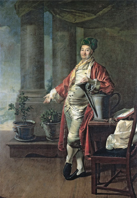 Прокофий Акинфиевич Демидов (1710–1786) – старший сын уральского горнозаводчика А. Н. Демидова, в нарушение традиций большого парадного портрета представлен в домашнем шелковом халате в образе садовника, указывающего на оранжерейные цветы. Демидов действительно увлекался ботаникой, выращивал редкие растения (на столе лежат очень дорогие по тем временам луковицы тюльпанов и раскрытая научная книга). За колоннадой на заднем плане виднеется Московский воспитательный дом, на содержание которого Демидов жертвовал огромные деньги.