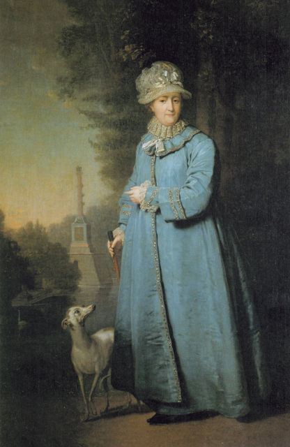 Боровиковский писал императрицу за год до ее смерти. Екатерина II изображена без регалий – как обычная помещица в чепце и утреннем капоте, гуляющая по парку с тонконогой белой собачкой. Только обелиск на заднем плане свидетельствует, что перед нами значительная особа. Обелиск – это памятник в честь побед русского флота, установленный посреди Большого пруда в Царском Селе, где любила проводить летние месяцы Екатерина II. Современники писали, что в преклонном возрасте она сохранила прекрасный цвет лица, живые и умные глаза, приятно очерченный рот. Одевалась на прогулки она действительно довольно просто. Есть свидетельство, что художнику позировала одевшаяся в платье императрицы ее любимая прислуга – М. С. Перекусихина.