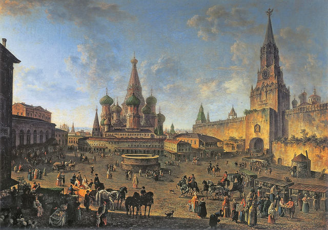 Алексеев оставил нам драгоценные свидетельства о том, как выглядела Москва до пожара 1812 года и последующей большой реконструкции Кремля. Кремлевская стена со Спасской башней на первой картине имеет сероватый цвет – она оштукатурена и очень сильно обветшала. Панораму Красной площади замыкает собор Василия Блаженного, окруженный многочисленными постройками. Во втором пейзаже Кремль предстает как цитадель московской старины и святости. Плавный изгиб Каменного моста и низкие берега Москва-реки служат Кремлю своеобразным обрамлением, вводят зрителя в повседневный мир горожан.