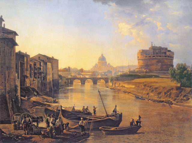 В пейзаже Щедрина образ Вечного города одновременно величественный и интимный. Тяжелая каменная громада замка Св. Ангела уравновешена зданиями и лодками на левом берегу Тибра. Величавое, плавное течение реки «подводит» взгляд зрителя к древнему арочному мосту и силуэту собора Св. Петра – символу величия Рима. На первом плане мирно и неспешно течет повседневная жизнь горожан: они вытаскивают лодку на берег, готовятся выйти под парусом, спешат по своим делам… Все детали пейзажа – живые, увиденные в натуре, лишенные академической условности. Очень красива сама живопись картины: все окутано воздухом, пронизано утренним мягким, рассеянным светом.