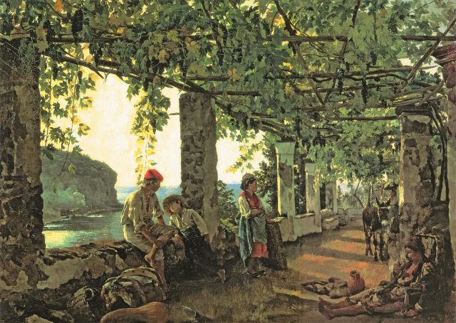Один из лучших пейзажей художника, написанный в окрестностях Неаполя, пронизан эллинским духом ясного покоя и светлой гармонии. Природа предстает у Щедрина как образ рая на земле. Веет свежим и влажным дыханием моря, ароматом нагретых виноградных листьев. Укрывшиеся на веранде от палящего солнца люди предаются блаженному отдыху. Золотистые солнечные лучи проникают сквозь сплетенные ветви винограда, ложатся бликами на каменные опоры веранды, отражаются яркими отблесками на выгоревшей траве… Щедрин виртуозно передает сложнейший эффект освещения, достигая невиданного раньше в пейзаже единства света, цвета, воздушной стихии.