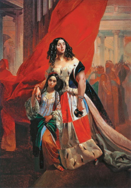 Этот лучший парадный портрет мастера был написан в Петербурге, куда эксцентричная и независимая графиня приехала получать огромное наследство. На картине она изображена вместе с приемной дочерью, которая своей хрупкостью оттеняет и дополняет роскошную, зрелую красоту Самойловой. Движение фигуры графини уравновешено мощным разворотом тяжелого бархатного занавеса, который словно продолжается в ее ослепительно-роскошном платье.