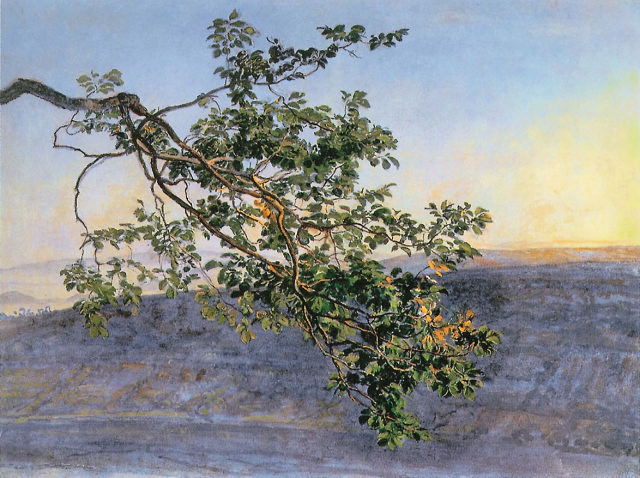«Ветка» – один из лучших этюдов Иванова, написанных во время поисков пейзажа для картины «Явление Христа народу». На фоне ослепительной лазури итальянского неба одинокая ветка оливы склонилась над бескрайней сиренево-голубой долиной. Она воспринимается как гимн гармонии мироздания, сотворенного Творцом.