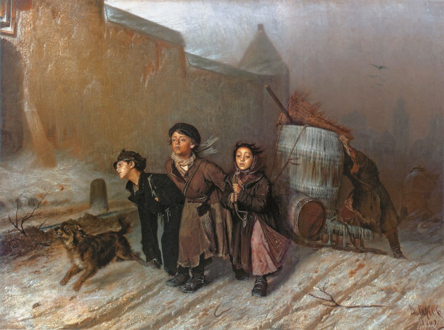 Художник изображает типичное для России этого времени явление – узаконенный детский труд. Трое изможденных маленьких мастеровых тянут тяжелую, обледеневшую бочку с водой по заснеженной дороге вдоль стены Рождественского монастыря в Москве. Сзади сани подталкивает сердобольный прохожий, спереди мчится пес, словно желая придать детям сил. В их мягко выделенных светом лицах – черты милого обаяния и кротости, чистоты и доверчивости. Картина обладает ярко выраженной плакатной интонацией: она взывает к совести власть имущих, останавливает и заставляет задуматься, сострадать.