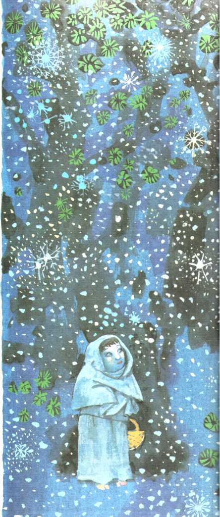 Ищет о-Тиё землянику в глубоком снегу, а сама думает: «Верно, мачеха послала меня сюда на погибель. Никогда не найду я в снегу земляники. Тут и замёрзну».