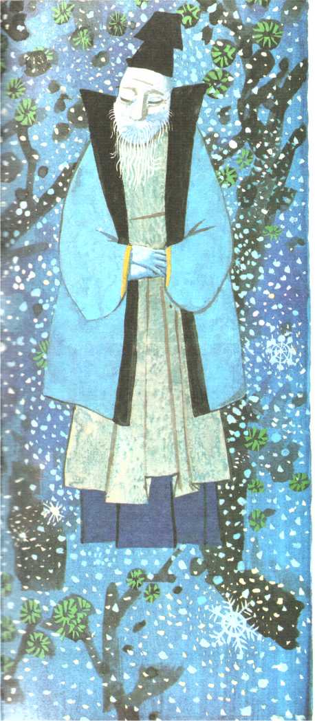 Шагает старик по снегу легко-легко. О-Тиё за ним бежит. И вот диво: только что она в рыхлый сугроб по пояс проваливалась, а теперь стелется перед ней крепкая, хорошая дорога.