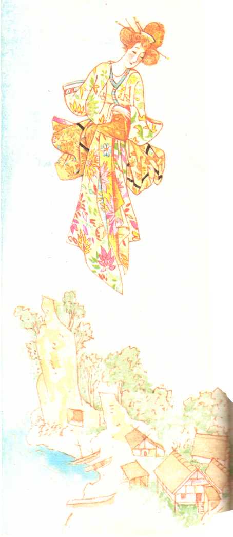 Набрала о-Тиё полную корзину и побежала со всех ног домой. Тут горы сами собой раздвинулись и в одно мгновение оказались далеко позади, а перед девочкой, словно из-под земли, родной дом вырос.