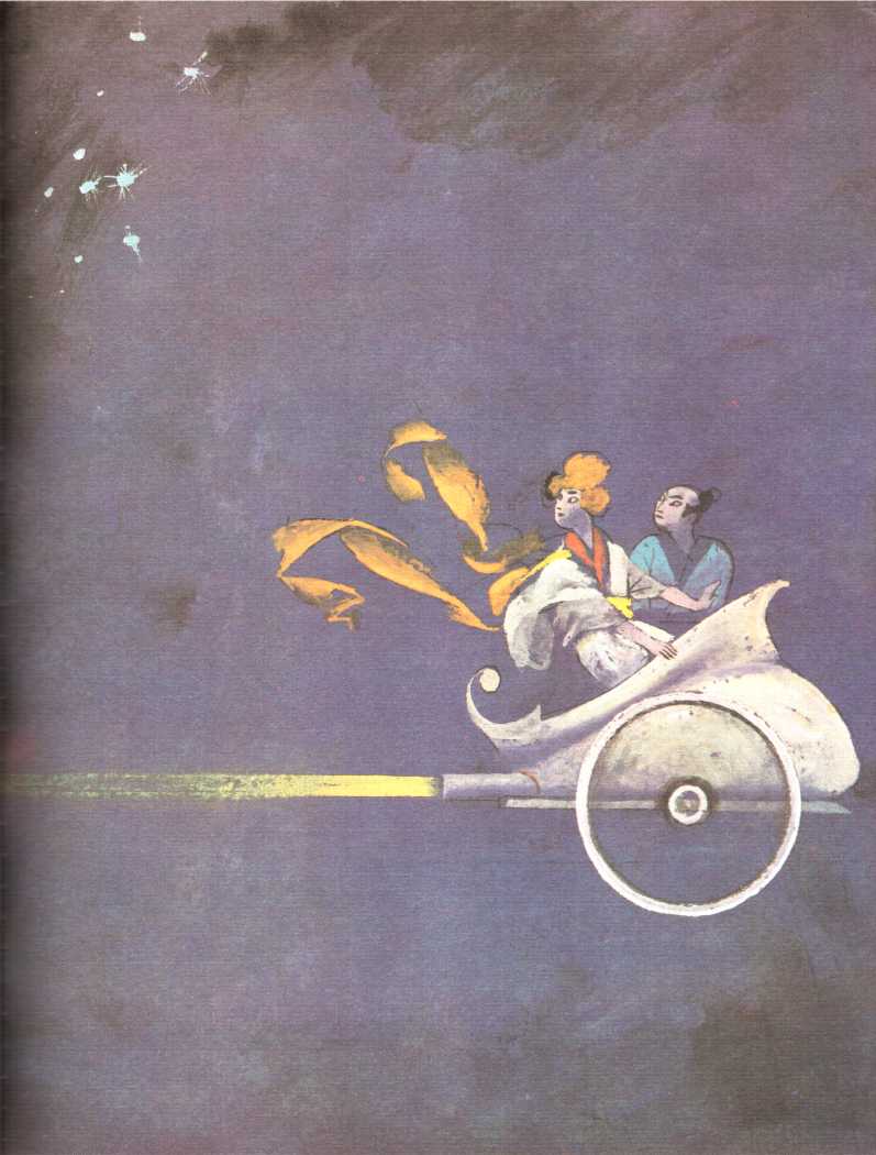 Взлетела колесница на воздух. Мчится, только ветер в ушах свистит. Вот и остров Кэкэгасима из виду скрылся. Обрадовались Санта с женой, полегчало у них на сердце.
