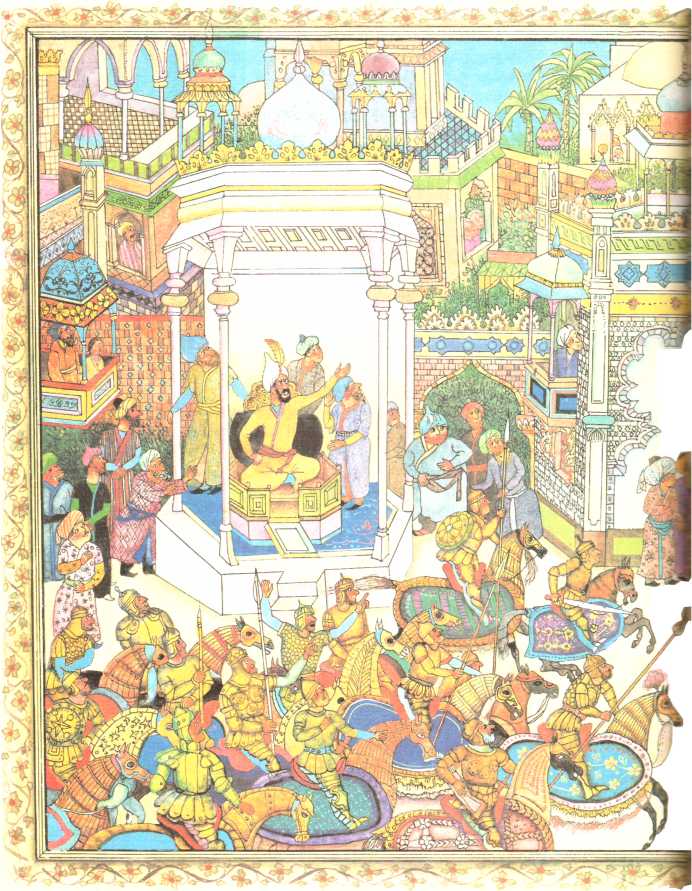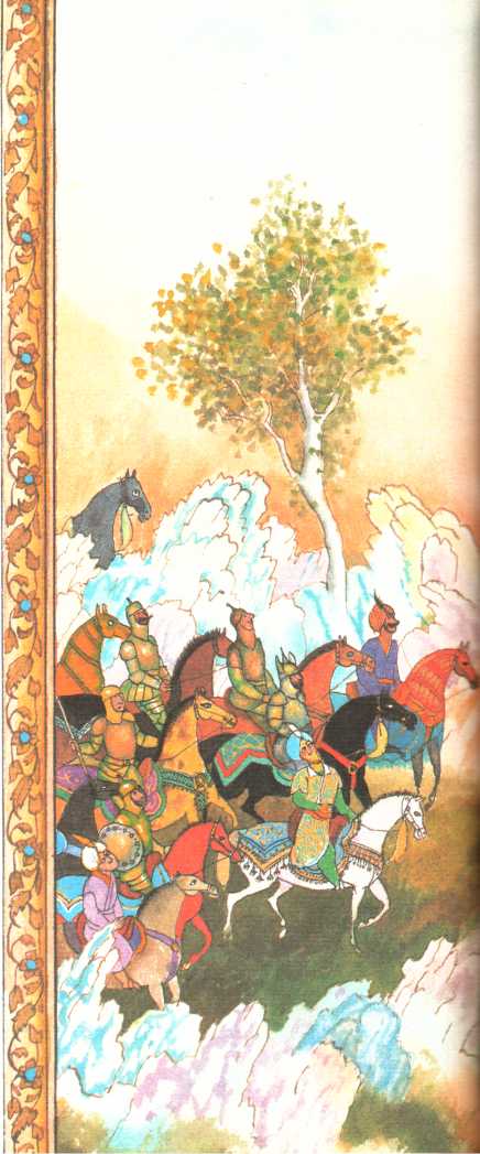 Зумурруд поняла, что ей нет спасения, и заплакала. Они летели весь день и вечером опустились на зелёный луг, недалеко от города. А в городе жил царь этой страны. И случилось, что царь как раз в это время охотился. Он заметил мудреца с девушкой и конём, и не успели те двинуться, как рабы царя бросились на них, схватили обоих и привели к царю.