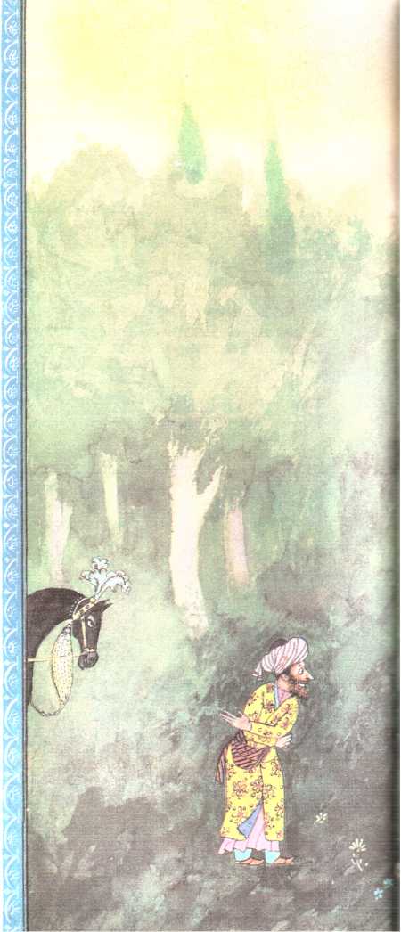 И это действительно было так. Когда Хасан рассказывал царю о том, где он оставил царевну, мудрец стоял за дверью и слушал. А потом побежал в сад эмира Махмуда. Придя туда, он увидел своего коня и очень обрадовался. Оказалось, что все винты в порядке и у коня ничего не сломано. Тогда мудрец вошёл в беседку и поклонился царевне.