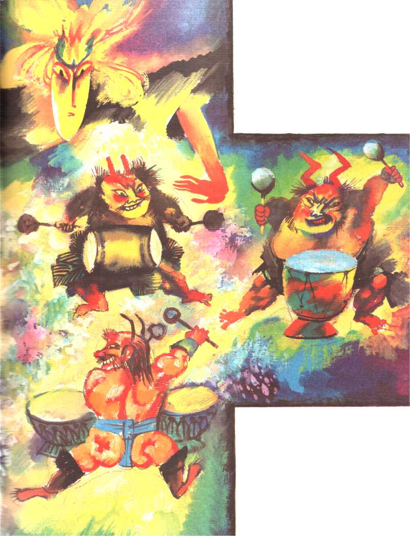 Тут как раз идут рогатые черти, стуча в барабаны. Это и были громовики. Рассказал им Тораян про свою беду.