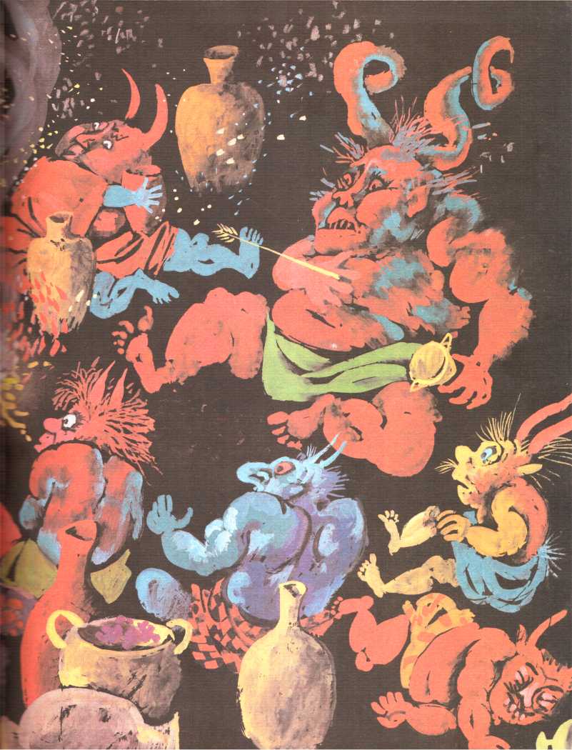 Что тут поднялось! Зашумели все, загалдели. Красные черти от страха стали синими, а синие так завопили, что покраснели от натуги.