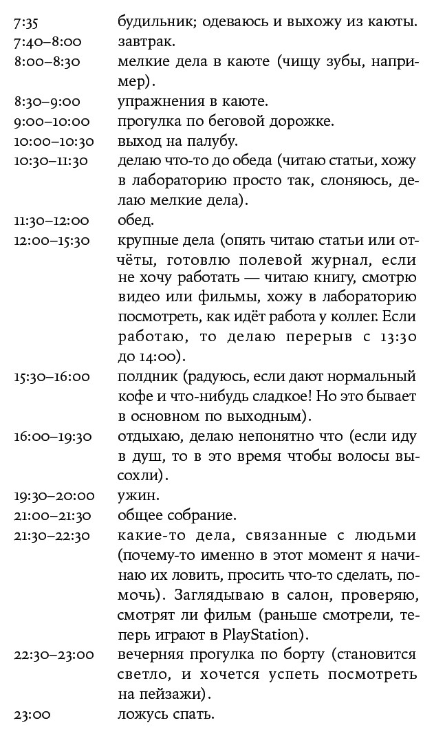 Официально начали дрейф в семь утра по Москве, вывалили на лёд (я – впервые), стреляли огнями, фотографировались. Нашу группу геологов быстро щёлкнул журналист на фоне пресловутой льдины: слева полноватый смуглый мужчина лет пятидесяти с чёрной бородой, справа – помладше, высокий и носатый, а посередине я – огромные очки от солнца на округлом лице, наполовину скрытом зелёным шарфом, все дружно улыбаются. «Роговицкий» ушёл – видно в иллюминатор. На полдник – торт и Ritter Sport молочный с орехами. Раньше я бы порадовалась шоколадке, а теперь, когда давно не ела сладкого, чувствую, что это просто куча сахара, невкусно.