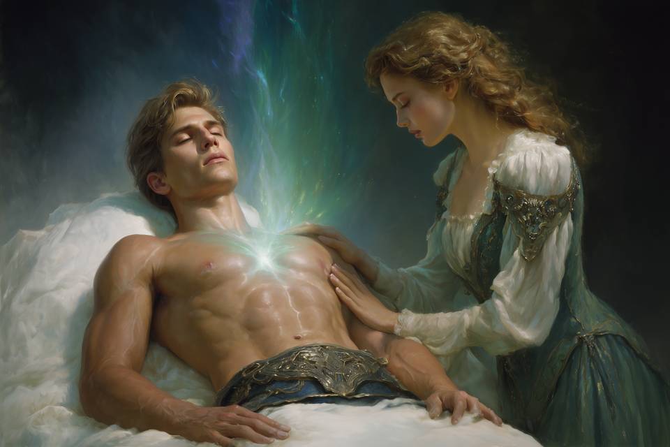 Я остановилась перед постелью, на которой, вытянувшись во весь рост и потому едва на ней помещаясь, лежал красивый статный мужчина с коротко, почти по-военному остриженными каштановыми волосами. Похоже, кто-то из офицеров. Был ли он без сознания или его намеренно ввели в сон, но он не шевелился и тихо ровно дышал. С него успели снять часть доспеха, убрали с груди обрывки рубашки, и теперь я могла хорошо рассмотреть глубокую рану в его левом плече, чуть выше сердца.