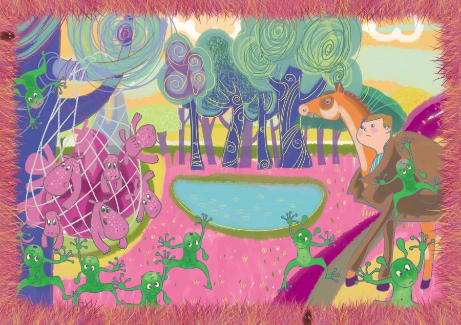 «Повезло» им практически сразу. Не успел Ктокто произнести последнюю фразу, как Петька услышал чьи-то душераздирающие вопли. Буквально в двух шагах от тропинки, по которой они шли, Петька увидел высокое дерево, на котором висела сетка, сплетённая из проволоки, а внутри сетки, как картошка в мешке, барахталась целая кучка маленьких существ, похожих на небольших бегемотиков. Именно они и кричали изо всех сил, размахивая ручками и ножками и безуспешно пытаясь выбраться. Вокруг сетки суетились другие существа, напоминавшие небольших человечков, но с присосками на руках и ногах, какие бывают у ящериц. Ктокто объяснил, что в сетке сидят цурипопики, а блямблямчики пытаются помочь им выбраться.