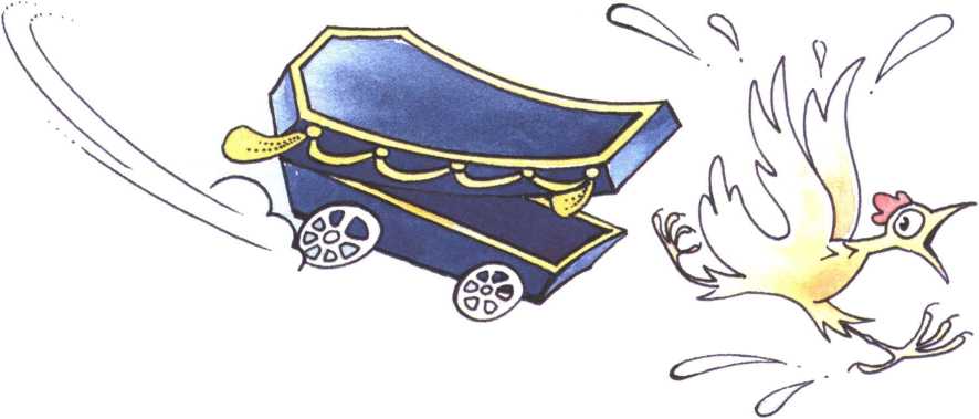 А гроб на колёсиках уже катил по улице, хищно открывая крышку. Никого, кроме друзей, на улице не было, только одна курица взъерошенная кудахтала и металась туда-сюда. На глазах онемевших от ужаса друзей гроб на колёсиках к ней подъехал, крышку приподнял и – АМ! – словно соломинку пополам перекусил.