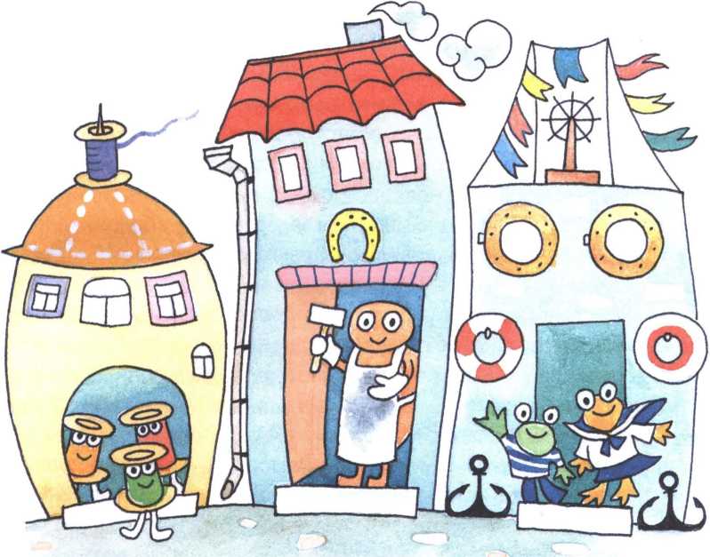 – Про белое каление вы теперь знаете, а про белые нитки слышали? – подкатились Фильке с Макаром под ноги озорные разноцветные фразеологизмы-катушечки. – Мы вон из того домика – портновского, – показали они на кругленький дом, крышу которого украшала металлическая катушка с воткнутой в неё иголкой.