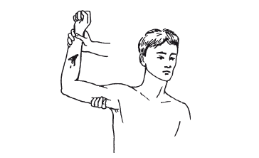 При остановке кровотечения из подключичной области и верхней половины плеча валик вкладывают в область подмышечной ямки. Руки надо согнуть в локтевых суставах, завести за спину и плотно зафиксировать одну к другой при помощи брючного ремня или бинтовой повязки.