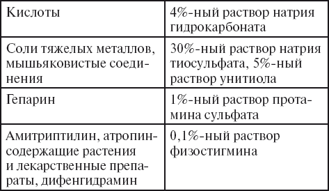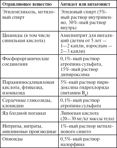 При оказании неотложной помощи при острых отравлениях используют антидоты – противоядия (связывают отравляющее вещество и выводят его из организма) и вещества-антагонисты (оказывают противоположное действие). Антидоты вводят в первые часы, редко – в течение 1–2 суток после попадания отравляющего вещества внутрь (табл. 2).