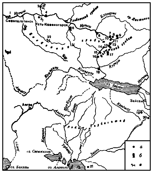 1 – Семипалатинск; 2 – Камышника: 3 – Измайловка; 4 – Зевакино; 5 – Ленинка; 6 – Тускаин; 7 – Мало-Красноярка (у парома); 8 – Мало-Красноярка (на андроновском поселении); 9 – Кок-Терек; 10 – Юпитер; 11 – Чистый яр; 12 – Канай; 13 – Кула-Журга; 14 – Баты; 15 – Славянка; 16 – Кызыл-Ту; 17 – Чердояк; 18 – Усть-Буконь; 19 – Чиликта; 20 – Чаган-Обо; 21 – Джар-Булак; 22 – Тамураши.