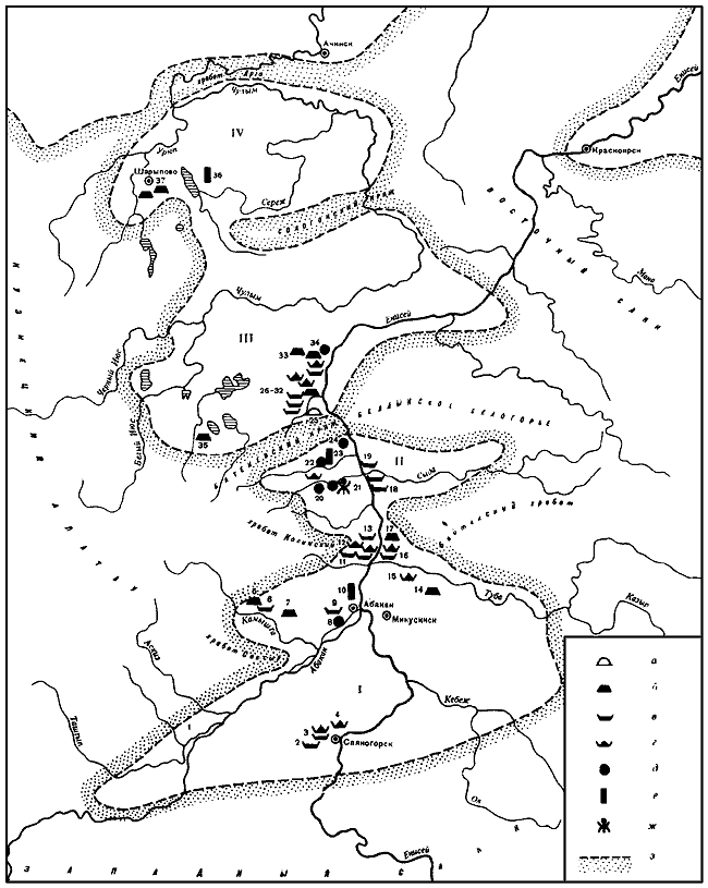 а – большие курганы; б – склепы; в – могильники; г – впускные захоронения; д – поселения, городища; е – клады; ж – писаницы; з – границы котловин.