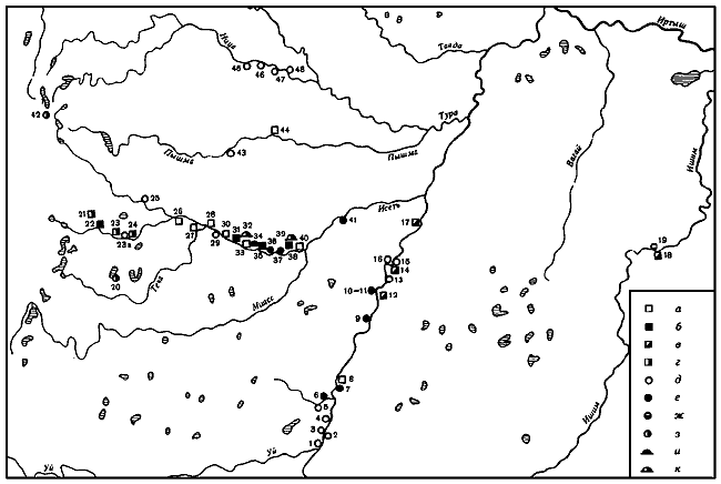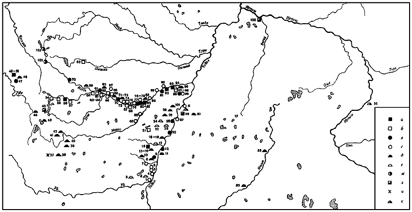 а – городища, известные по разведкам; б – городища, исследованные раскопками; в – находки воробьевской керамики на баитовских городищах; г – находки воробьевской керамики на гамаюнско-иткульских городищах; д – селища, известные по разведкам; е – селища, исследованные раскопками; ж – находки воробьевской керамики на баитовских селищах; з – находки воробьевской керамики на гамаюнско-иткульских селищах; и – курганный могильник; к – находки воробьевской керамики в насыпях курганов гороховской и саргатской культур.