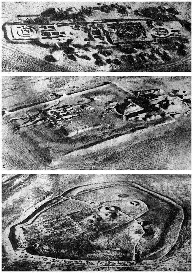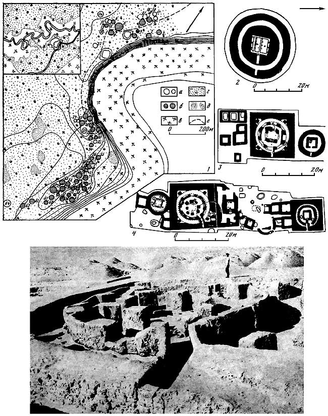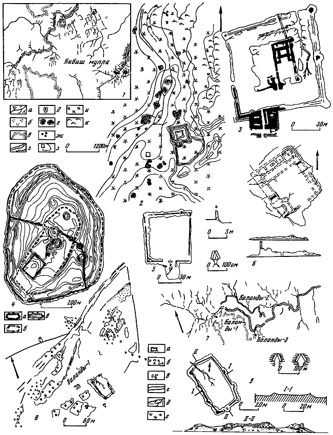 1–3 – Бабиш-Мулла: 1 – план ирригационной сети в окрестностях Бабиш-Муллы (а – каналы; б, ж – поселения; в – граница песков; г – старицы; д – крепость Бабиш-Мулла 1; е – скопления керамики; з – погребальное сооружение Бабиш-Мулла 2; и – такыры; к – кусты саксаула); 2 – план местности Бабиш-Мулла; 3 – «донжон» и цитадель городища Бабиш-Мулла 1; 4 – городище Чирик-Рабат; 5 – городище Кабулкала; 6 – Сенгиркала; 7 – урочище Баланды; 8 – окрестности Баланды 1 (а – крепость; б – россыпи керамики; в – развалины построек; г – русла; д – каналы; е – растительность); 9 – городище Баланды 1.