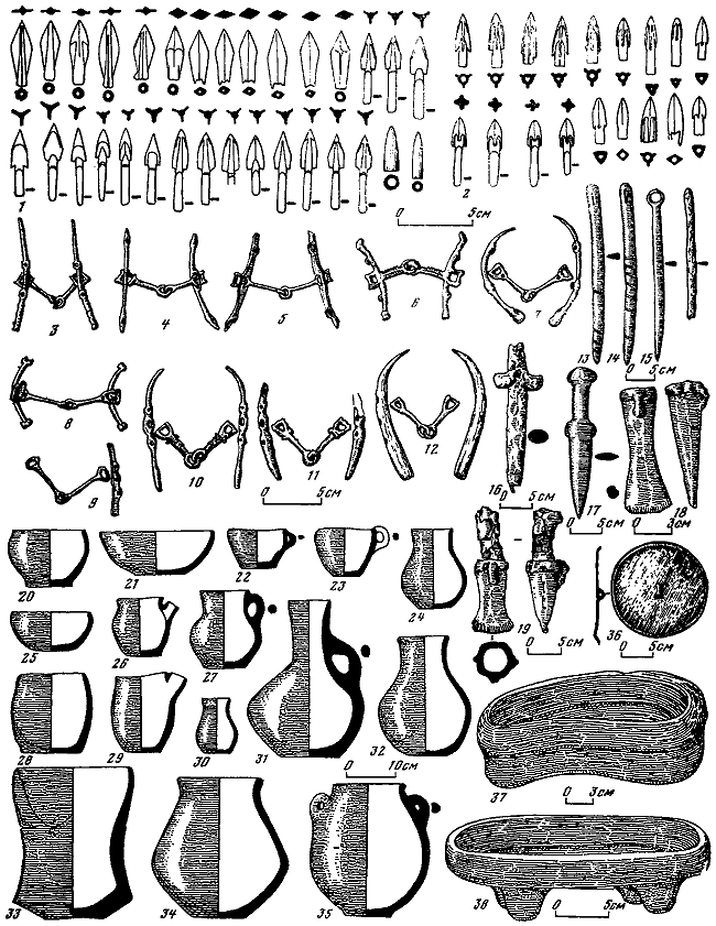 1-11, 13, 14, 17–19, 36 – бронза; 1а – кость; 12 – бронза и кость; 15, 16 – железо; 20–30, 32, 35 – лепная посуда; 31, 33, 34 – станковая посуда; 37, 38 – камень.