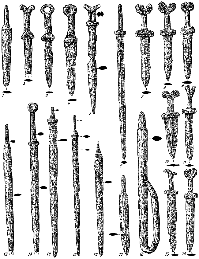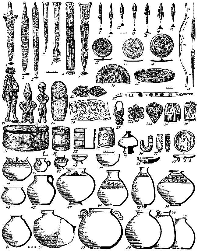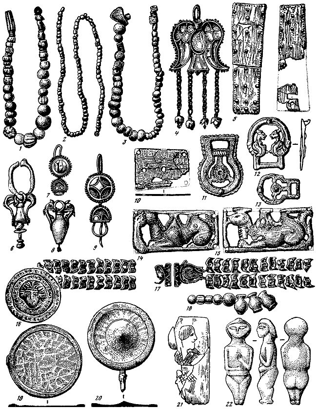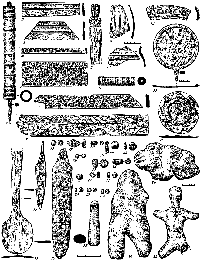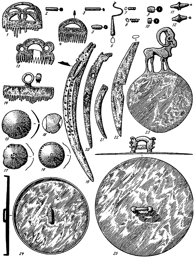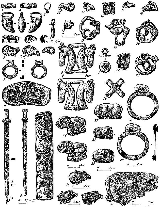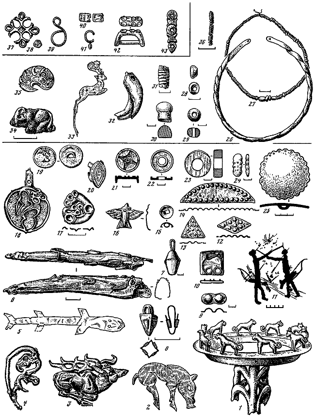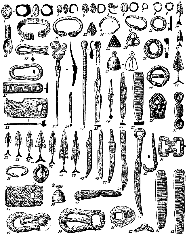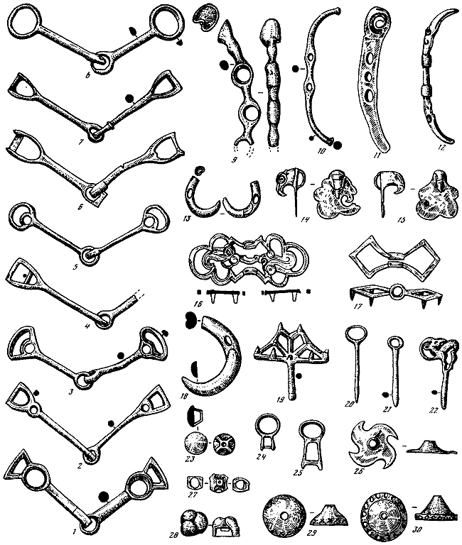 1-11, 19–24 – бронза; 13 – золото; 16 – серебро; 25 – кость; 27–34 – глина.